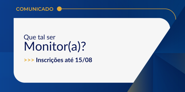 Estão abertas as inscrições para o Programa de Monitoria 2025/2. O prazo é até o dia 15 de agosto. Atente-se às orientações abaixo: